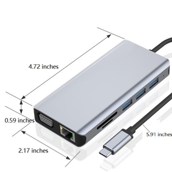 11-in-1 HDMI Adapter: With HDMI+VGA+USB3.0*4+audio3.5+SD/TF+PD+RJ45 100Mbps.These ports can work simultaneously. Designed for devices with Type-C ports that support video and audio output modes. This USB C docking station allows to extend your USB C laptops to different monitors, and supports full HD 4K video using HDMI port.This solves the user’s perfect display device connection scheme, and the PD, data and other functional applications.Customize them with your brand name engraved in them. Made from aluminum alloy material, measuring 4.72 * 2.17* 0.59 inches, this custom 11 in 1 laptop docking station type c hub adapte. Usage Scenarios: Office supplies, school stationery, corporate promotions, trade show giveaways. Tailored branding: Supports logo imprint and design personalization. Product Highlights: Portable, durable, practical for daily use.