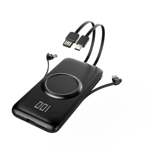20000mAh Li polymer high capacity battery with QI wireless charger all in one compact design, easy to carry, extremely convenient for travel and daily use in charging electronic devices i.e. mobile phones, cameras and tablets. Universal compatibility with mobile phone, built-in Micro Cable, Type-C Cable and Apple Cable, total three cables for mobile phones directly. No need to carry charging cables for your phones anymore, cool. Portable Charger can charge many devices at once. Compatible with any Qi enabled mobile phones and devices. Have LCD Display to show the power situation. Custom LOGO is available. Price for over 5000 is for sea shipment. Made from plastic material, measuring 5.8*2.8*1 inches, this custom 20000mah qi wireless charger power bank built in cables. Usage Scenarios: Office supplies, school stationery, corporate promotions, trade show giveaways. Customization available: Print your logo or customize packaging and color schemes. Product Highlights: Compact size, lightweight, easy to carry.