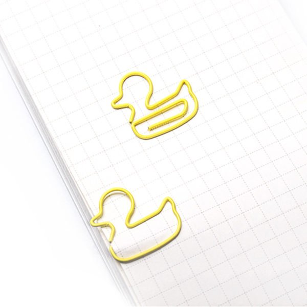 Send your logo to your customers- office by handing out this durable paper clip.This novelty cartoon paper clip comes in the shape of a duck and it has a yellow finish.It is made of metal and measures 1.18 inches*0.83 inches.These paperclips are stored in a transparent round plastic box and 12 pieces are contained in each box.Due to the compact size it can be carried in your pouch or bag easily.The surface of the box has plenty of space to ensure your logo is properly advertised.It’s perfect for marking pages, binding papers or attaching memos. This custom cartoon duck shaped metal paperclip in a box. Usage Scenarios: Office supplies, school stationery, corporate promotions, trade show giveaways. We offer logo printing and full packaging customization. Product Highlights: Writable surface, lightweight, recyclable paper.