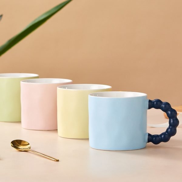 The cups are fired at a high temperature and can be filled with boiling water directly. The cups are made of reinforced new bone china, fine clay material, pure porcelain, and high-density cups. The glaze is made of minerals, feldspar, and other materials, no lead, no mercury, and other heavy metals. Frosted glaze, smooth inside the cup, very suitable for drinking water, coffee, and other beverages. Thick handle, elegant and beautiful, thoughtful design, comfortable hand feeling, drink anywhere, anytime. The bottom of each cup is smoothed to prevent scratching the table surface. Made from ceramic material, measuring 3.07*3.46 inches, this custom ceramic color mug with beaded handle 10oz. Usage Scenarios: Office supplies, school stationery, corporate promotions, trade show giveaways. Customization available: Print your logo or customize packaging and color schemes. Product Highlights: BPA-free, leak-proof, travel-friendly.