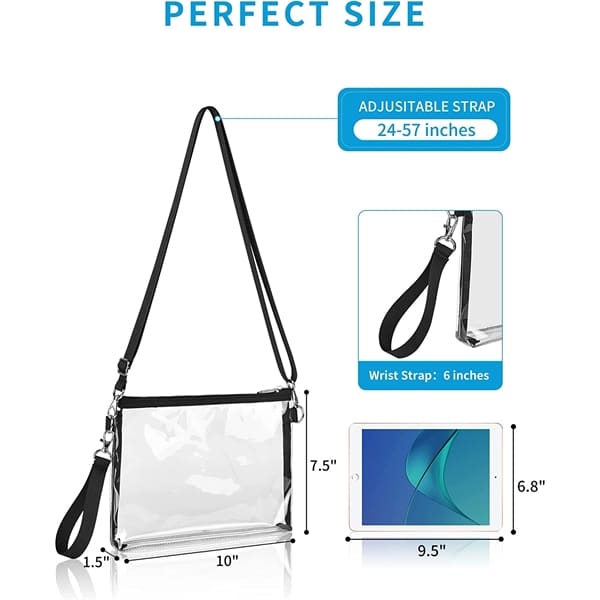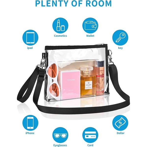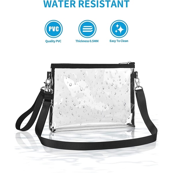 This transparent cross body shoulder bag is made of 0.3 mm PVC, which is sturdy, waterproof and BPA-free. It allows you to view what is inside quickly. Clear Purse is easy to clean and can be wiped directly with a damp cloth. The convenient wrist strap allows you to carry it easily. It can also be used as cross body bag with a shoulder strap which can be adjusted from 28-55 inches.Multi-purpose for All Situations: Want a practical and fashionable transparent purse? With our clear handbag you can go with it for stadium, concert, festival, raves, airport, any outdoor activities!
