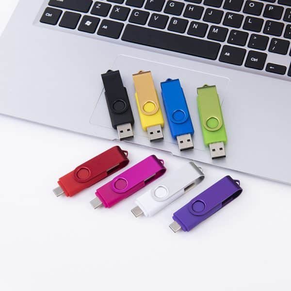 Introducing the Colorful Double-Head Rotating USB Flash Drive. This USB drive features a durable, movable stainless steel casing that easily rotates to reveal the USB or TYPE-C connectors. The TYPE-C connector allows you to plug it directly into your phone. Available in multiple colors. Ideal for trade shows or as a promotional giveaway. Customizable with your brand logo. Made from alloy material, measuring 2.20*0.71 inches, this custom colorful double-head rotating usb flash drive. Usage Scenarios: Office supplies, school stationery, corporate promotions, trade show giveaways. Customization: Logo printing available with multiple packaging and color options. Product Highlights: Compact size, lightweight, easy to carry.