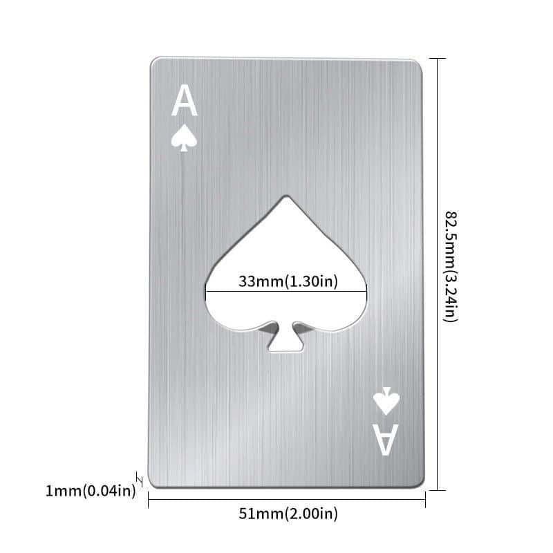 The Creative Ace of Spades Bottle Opener is crafted from stainless steel, featuring a spade-shaped cutout in the center for easy bottle opening. Designed to be the size of a credit card, it fits conveniently in your wallet for on-the-go use. Multiple color options are available, and you can customize it with your logo for a personal touch. Measuring 3.27*2.17 inches, this custom creative ace of spades bottle opener. Usage Scenarios: Office supplies, school stationery, corporate promotions, trade show giveaways. Customization: Logo printing available with multiple packaging and color options. Product Highlights: Sleek design, durable build, easy to grip.