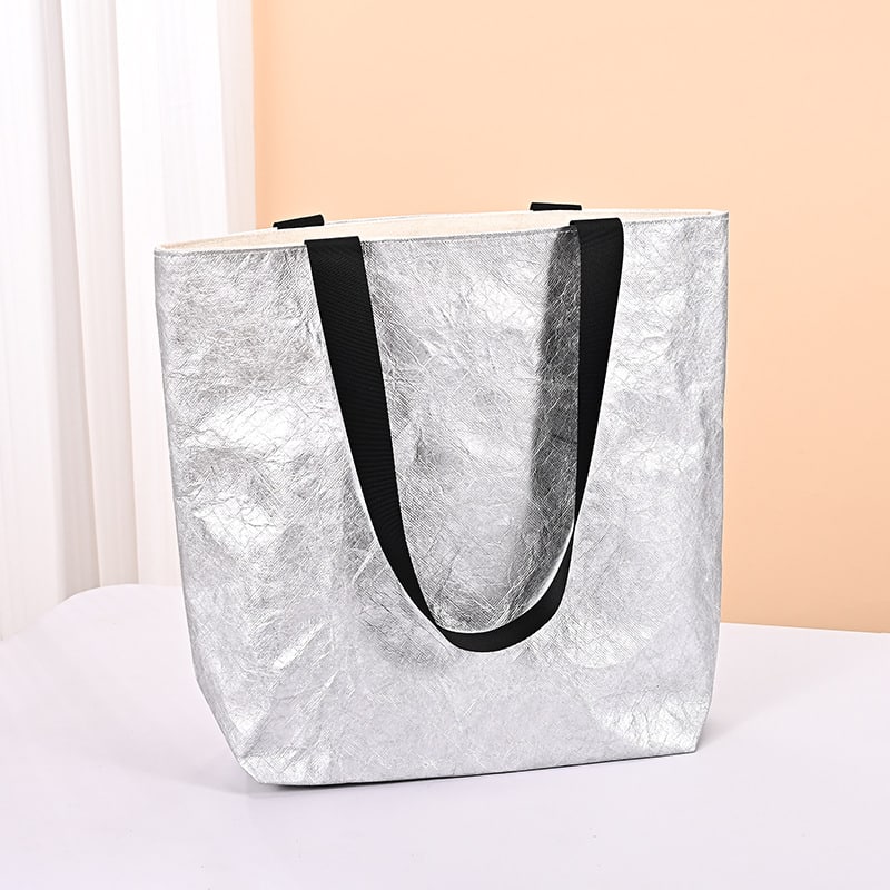 The bag is made of premium Dupont paper. Paper bag is environmentally degradable and safe for food. Dupont paper is a material that features all the best properties of paper, film, and fabric, but also provides unique beauty and strength. The bags are with handles, easy for you to carry. It can accommodate your magazines, pencil cases, mobile phones, wallets, keys ?C enough to meet your traveling needs. Your logo can be imprinted on it. Measuring 12.59*14.96*3.93 inches, this custom custom washable cowhide dupont paper tote bag. Usage Scenarios: Office supplies, school stationery, corporate promotions, trade show giveaways. Tailored branding: Supports logo imprint and design personalization. Product Highlights: Eco-friendly material, reusable, foldable for storage.