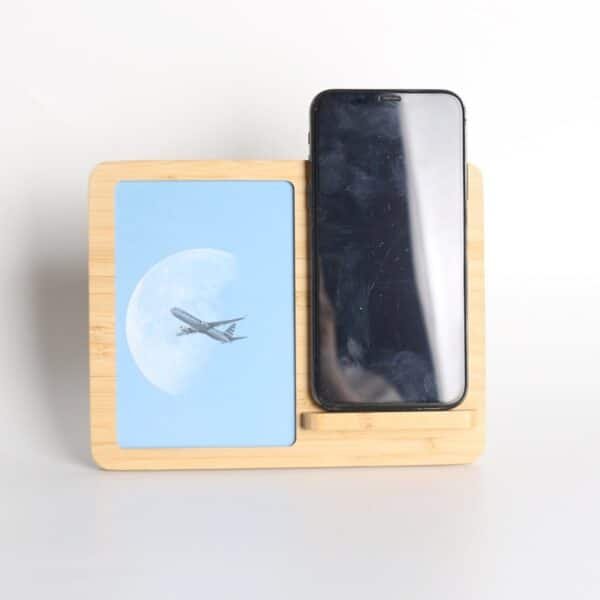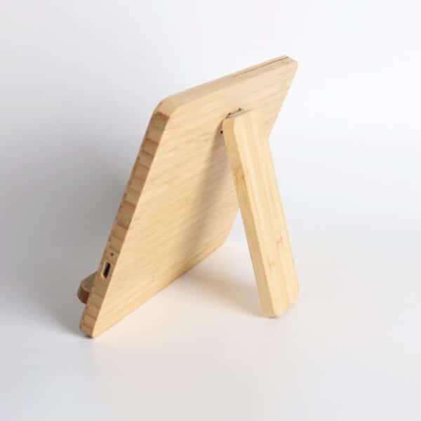 This wireless charger is perfect for use at home, in the office or even on the road. Additional imprinting options are available. Features Input: 9V/2A-3A; Output: 5W/7.5W/10W/15W.Requires Type-C connector (included). Charging distance = 10 mm. Made of sustainable bamboo. Only devices that support Qi wireless charging technology can be charged with this device. Sleek, modern, and eco-friendly renewable bamboo, let us show off your logo with laser engraving or a full-color digital imprint. Measuring 5.43*7*0.94 inches, this custom desktop photo frame bamboo wireless charger. Usage Scenarios: Office supplies, school stationery, corporate promotions, trade show giveaways. We offer logo printing and full packaging customization. Product Highlights: Compact size, lightweight, easy to carry.