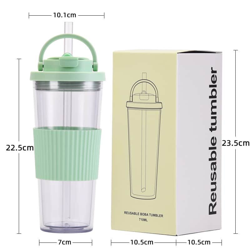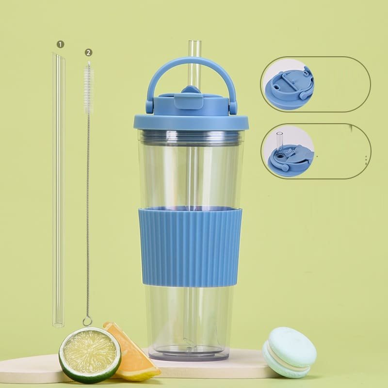The double-layer cup body is made of food-grade AS environmentally friendly material, safe drinking water, cold insulation, not easy to hurt your hand. Adopt plastic straw, durable, removable and washable, hygiene is the key. Concealed carry handle, dual-use design, convenient life, non-slip silicone waist cover, made of food-grade silicone, heat-resistant, surface texture design, to prevent hand slippage, easy to disassemble and clean. Convenient to use, non-slip and not hot, comfortable to the touch. Inverted non-leakage, 360??all-round leakage prevention, dripping water. Rich in colour, with a variety of water cups, add texture to life, happy drinking water every day.