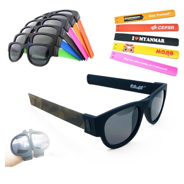 Showing your brand wherever you go! These shades have a slap bracelet-like design for easy storage, but wear just like conventional shades. Slap them down on your wrist, car steering wheel or around the strap of your beach bag for maximum portability, then slip them on when you need them. The design features durable silicone bows and lenses with UVB protection. Choose from five colors and add your school, sports team, organizational or company logo, emblem or message to customize. Made from plastic material, measuring Adult, this custom folding bracelet slaSunglassesUsage Scenarios: Office supplies, school stationery, corporate promotions, trade show giveaways. Tailored branding: Supports logo imprint and design personalization. Product Highlights: Portable, durable, practical for daily use.