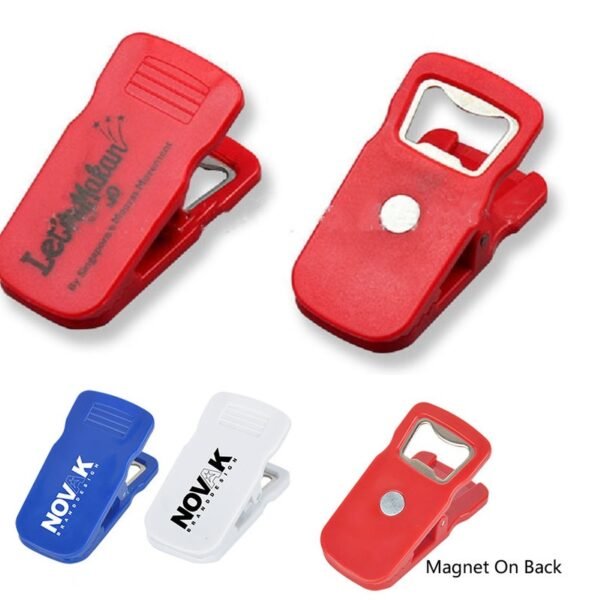 This magnetic bottle opener clip is a great item to keep on your refrigerator! With an approximate size of 1 2.99- x 1.5- this clip has a spring-loaded hinge, aluminum bottle opener and a magnet on the back side. Choose from several different color choices and add a silkscreen imprint of your company logo for top-of-mind brand awareness. This item contains one or more small magnets. Keep out of reach of small children.