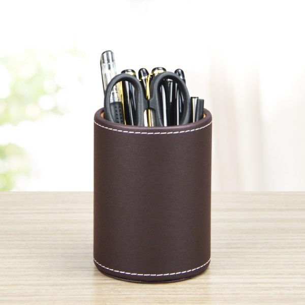 This cylinder pen holder is made of high quality PU. Totally vegan. Beautiful and durable. Perfect for holding your writing instruments and office accessories while keeping your desk stylish and organized. Available in two colors: black and brown. This desk organizer holds all the stationery you need while you work. You can store letter openers, pens, scissors, markers and more. Can also be used as a holder for makeup brushes. We can print your logo or slogan on the product! Measuring 3.1*3.1*4.2 inches, this custom pu black&brown cylindrical pen holder. Usage Scenarios: Office supplies, school stationery, corporate promotions, trade show giveaways. We offer logo printing and full packaging customization. Product Highlights: Sleek design, durable build, easy to grip.