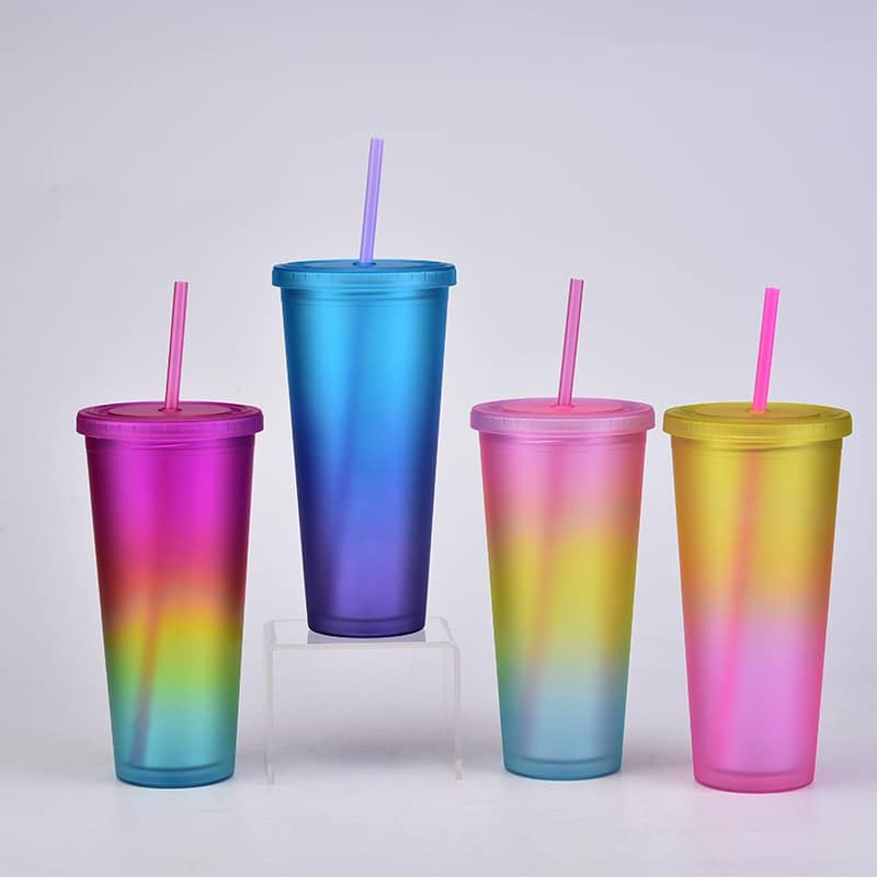 Rainbow Color Double Layer Plastic Straw Mug Frosted Handy Cup Outdoor Sports Bottle
