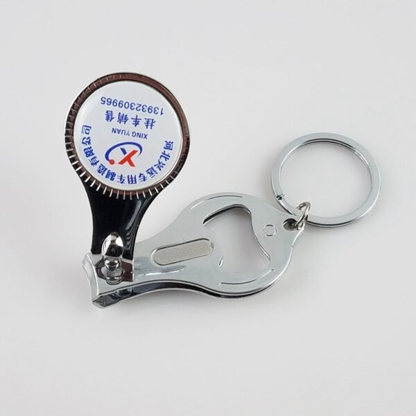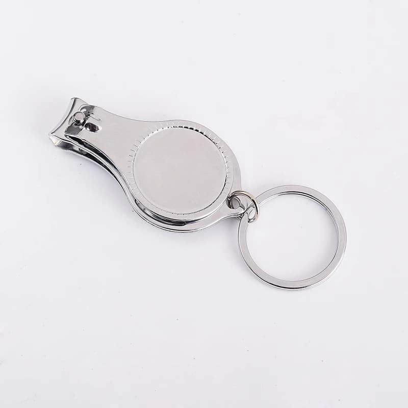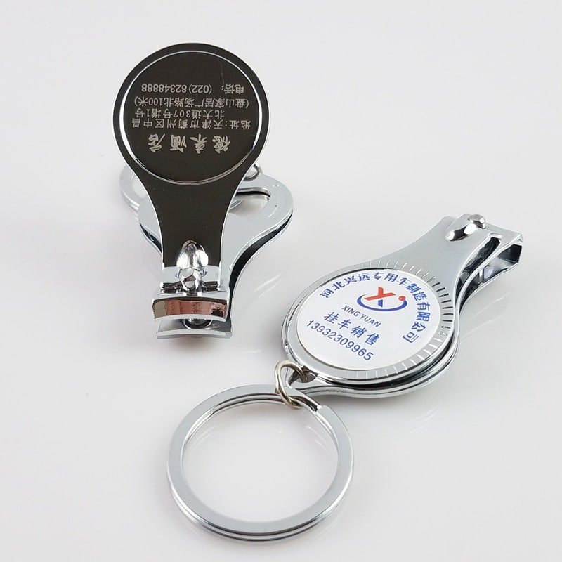 Round nail clippers. Traditional folding design. Includes bottle opener, emery nail file and beaded chain. Introducing our innovative round nail clipper, designed for precision and convenience. This compact tool is not only perfect for maintaining your nails but also doubles as a reliable bottle opener, making it an essential accessory for everyday use or outdoor adventures. Complete with a sturdy key ring, this nail clipper is easy to carry and always within reach when you need it. Made from metal material, measuring 2.36*1.29*0.59 inches, this custom round nail clipper w/bottle opener keyring. Usage Scenarios: Office supplies, school stationery, corporate promotions, trade show giveaways. Customization: Logo printing available with multiple packaging and color options. Product Highlights: Sleek design, durable build, easy to grip.
