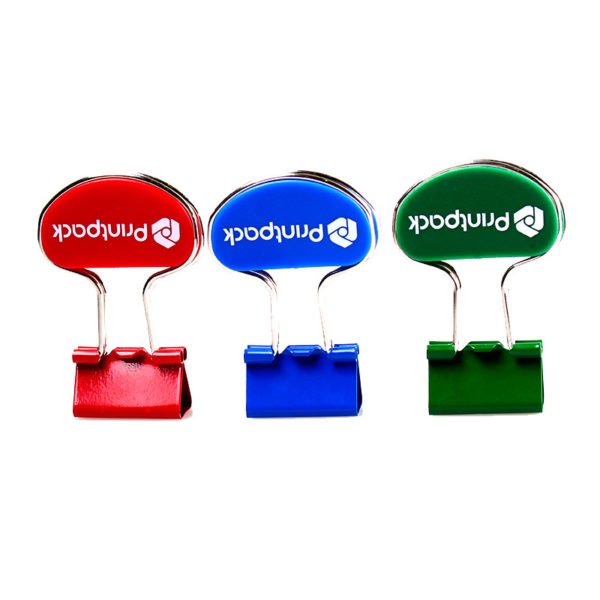 Put your company name in offices everywhere with these imprinted binder clips.It is made of metal and measures 2.24 inches*0.79 inches.It has paint finish and it includes a semicircle ABS handle which offers a great feel and a solid grasp.Strong metal spring and the clamp help grip items tightly. It’s prefect for organizing papers,bills, receipts, coupons or memos.The surface of the handle can ensure your logo is properly advertised.Choose from different item colors and custom your logo,slogan or brand message for a cool look your customers will love. This custom semicircle shaped metal binder clip paper clamp. Usage Scenarios: Office supplies, school stationery, corporate promotions, trade show giveaways. Customization: Logo printing available with multiple packaging and color options. Product Highlights: Writable surface, lightweight, recyclable paper.
