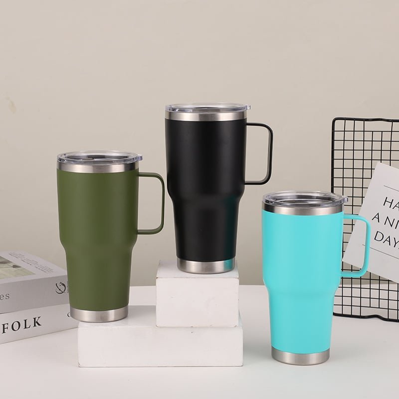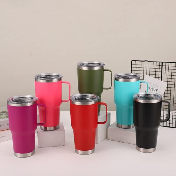 This unbeatable 30 ounce tumbler will turn every head in the office! Equipped with a layer of beautiful powder coating, a dishwasher-safe design, and made of recycled stainless steel, this item also includes double-wall vacuum insulation. Additionally, this product also has a full-cover top for added leak resistance along with an ergonomic and comfortable handle for easy carrying. And thanks to this tumbler’s narrow base, it can easily fit inside of car cup holders. Drink in the possibilities and order this for your next event! More information, please send your detailed request for quotation. Measuring 3.93*8.07 inches, this custom stainless steel multi-color tumbler with handle 30oz. Usage Scenarios: Office supplies, school stationery, corporate promotions, trade show giveaways. Customization: Logo printing available with multiple packaging and color options. Product Highlights: BPA-free, leak-proof, travel-friendly.