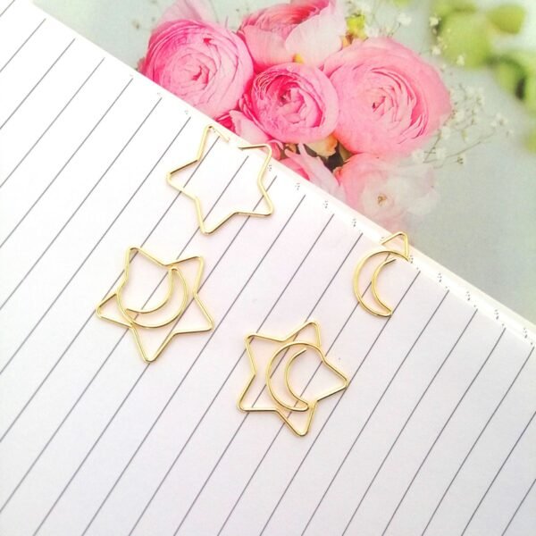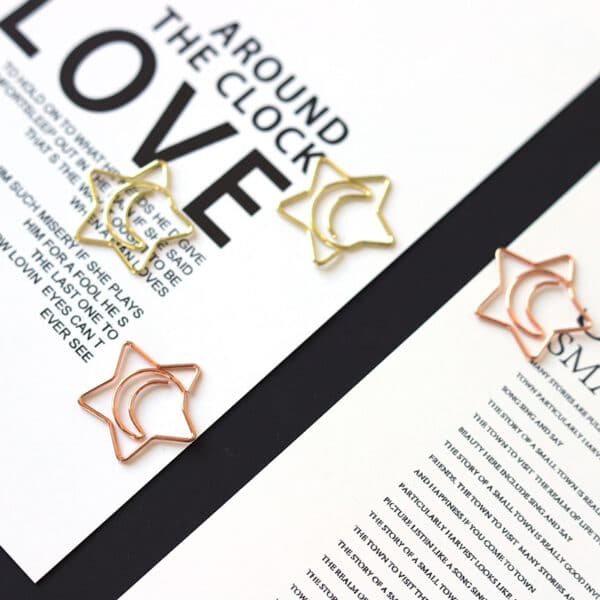 The lovely design and shiny appearance of the great paperclips will add extra color and more fun to your life, will bring you good mood. These paper clips are exquisite and durable. Made of premium stainless-steel materials, so they are not easy to rust and fracture, and can be used for a long time. These paper clips are very useful for documents, notebooks, scrapbooks and other office paper. Not easy to fade, simple design, but very cute, strong enough to clip paper well. Bring you fun and convenience during work in office, learning in school, daily use, etc. More materials for option, such as rubber coat, electroplating, PMS match painting, etc. Much packing methods for option, tin, small box, plastic pocket, etc. More information, please send your detailed request for quotation. Made from metal material, measuring 1.18*1.18 inches, this custom star and moon shaped paperclips. Usage Scenarios: Office supplies, school stationery, corporate promotions, trade show giveaways. Customization: Logo printing available with multiple packaging and color options. Product Highlights: Writable surface, lightweight, recyclable paper.