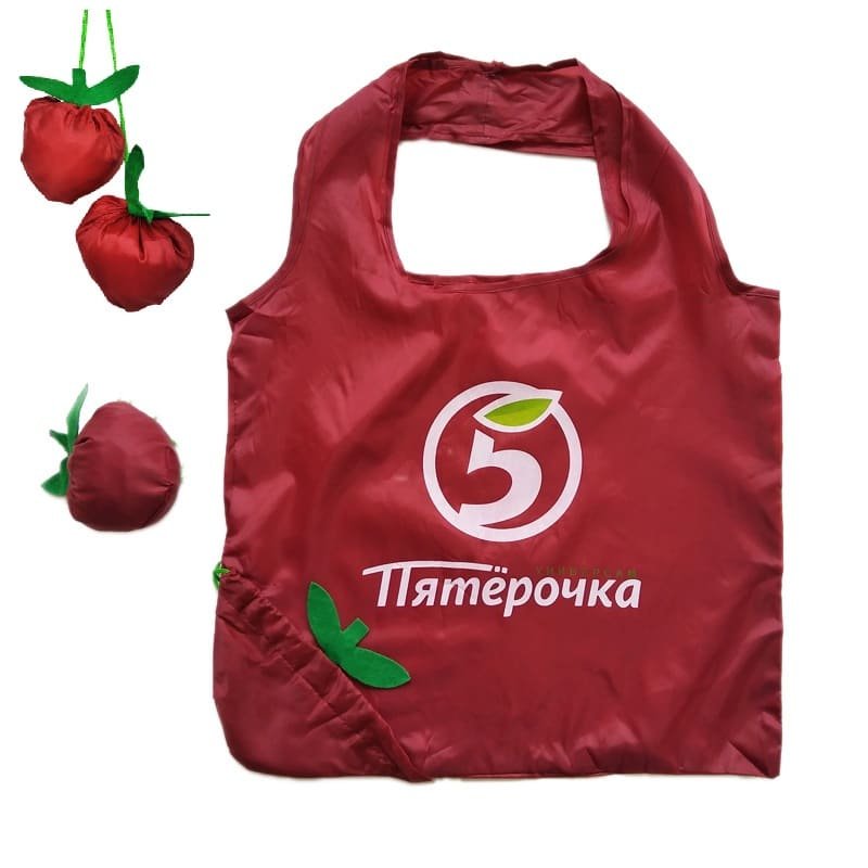 Strawberry Folded Eco Shopping Bag,190T Polyester shopper tote bag with corner pouch;Bag can be folded into drawstring pouch on corner forming a berry shape; Durable and foldable. The whole bag can be folded into a strawberry shaped pouch on the corner.The special shape is sure to catch the attention of people. Adjustable drawstring lock;customize with your company name and logo to create a giveaway perfect for wineries, liquor stores, tastings and more. Enhance your branding message with this awesome accessory!