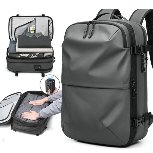 This Vacuum Compression Laptop Backpack offers an ultra-large capacity with a one-way air valve, allowing you to easily compress the contents by hand. Its multi-compartment design includes numerous pockets and a 180-degree open-flat section that can accommodate up to a 17-inch laptop. Made from waterproof Oxford fabric, this backpack is both durable and expandable, making it ideal for travel. It is also equipped with a secure combination lock for added safety. Available in black, gray, light gray, army green, and dark blue, this backpack is perfect for business trips and various travel needs. Customize it with your logo for a personalized touch. Measuring 19.29*12.60 inches, this custom vacuum compression laptop backpack. Usage Scenarios: Office supplies, school stationery, corporate promotions, trade show giveaways. Customization: Logo printing available with multiple packaging and color options. Product Highlights: Portable, durable, practical for daily use.