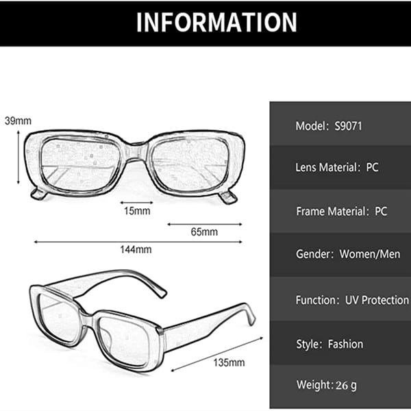 our rectanglSunglassesdopt high-quality material,PC frame,AC lens,light in weight,sturdy and durable,you can feel free to use them,safe without peculiar smell,the right size for most women,small and portable,easy to carry out and wearing them will not bring burden to your nose.UV400 eye protection effectively filters & blocks glares.protecting your eyes against UV damage when you go out,high-quality lens gives you a natural & clear vision,durable & shatterproof.90s RectangulaSunglassesfit for all kinds of faces.and it is good for taking photos, ins style,party,clothing accessories.