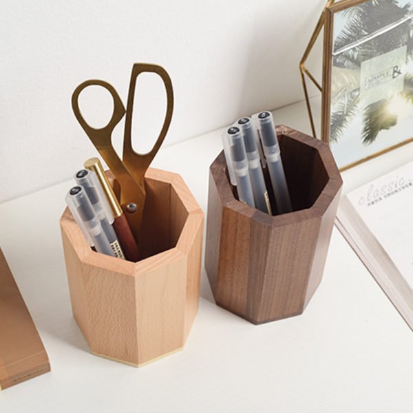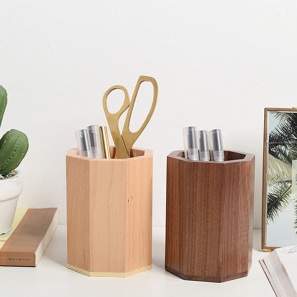 This pen stand is made of high-quality pine and beech wood. Eco-friendly and durable. Perfect for holding your writing instruments and office accessories while keeping your desk stylish and organized. Materials are renewable resources from responsibly managed forests. This desk organizer holds all the stationery you need while you work. You can store letter openers, pens, scissors, markers and more on this desk companion. Can also be used as a holder for makeup brushes. We can print your logo or slogan on the product! The absolutely perfect item for promotions or events! Measuring 3.1*3.1*4.3 inches, this custom wooden polygonal pen holder makeup brush container. Usage Scenarios: Office supplies, school stationery, corporate promotions, trade show giveaways. We offer logo printing and full packaging customization. Product Highlights: Sleek design, durable build, easy to grip.